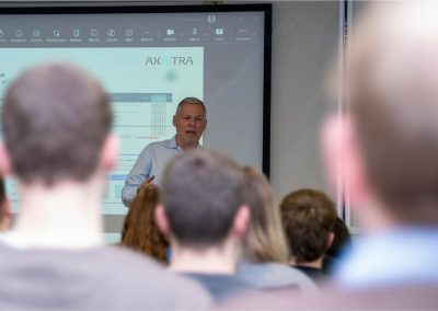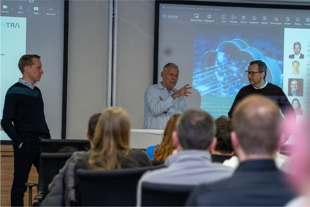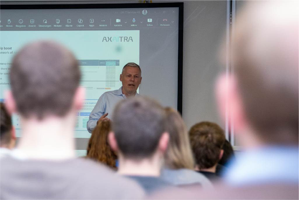 Zu Gast von Seiten AXAITRA waren Robert Helgert (CEO), Johannes Lindinger (Corporate Development) und Werner Leibrandt (COO). Zusätzlich war Jennifer Friedrich (Business Managerin) online zugeschaltet. Nach einer kurzen Vorstellungsrunde der Gäste folgte eine Präsentation zur AXAITRA Gruppe, ihrer Ausrichtung und dem Partnerverbund, zu dem LM IT seit Kurzem gehört.
