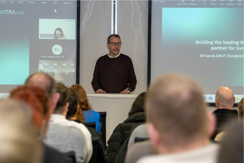 Am vergangenen Freitag durften wir bei LM IT Services AG besonderen Besuch begrüßen: Vertreter der AXAITRA Gruppe waren bei uns im Haus zu Gast, um sich persönlich vorzustellen und Einblicke in das Unternehmen sowie die gemeinsame Zukunft zu geben. Eingeladen waren alle Kolleginnen und Kollegen – und das Interesse war groß: Unser Veranstaltungsraum war bis auf den letzten Platz gefüllt.