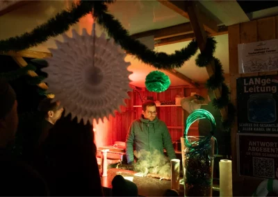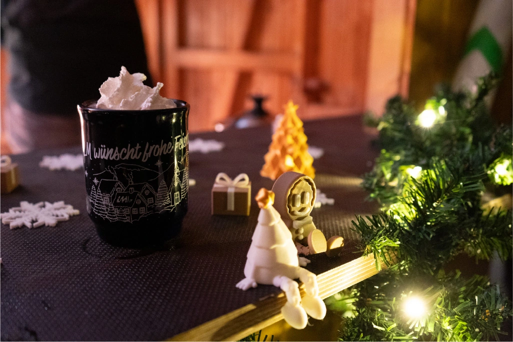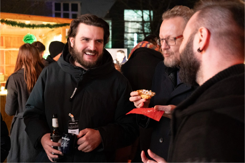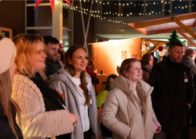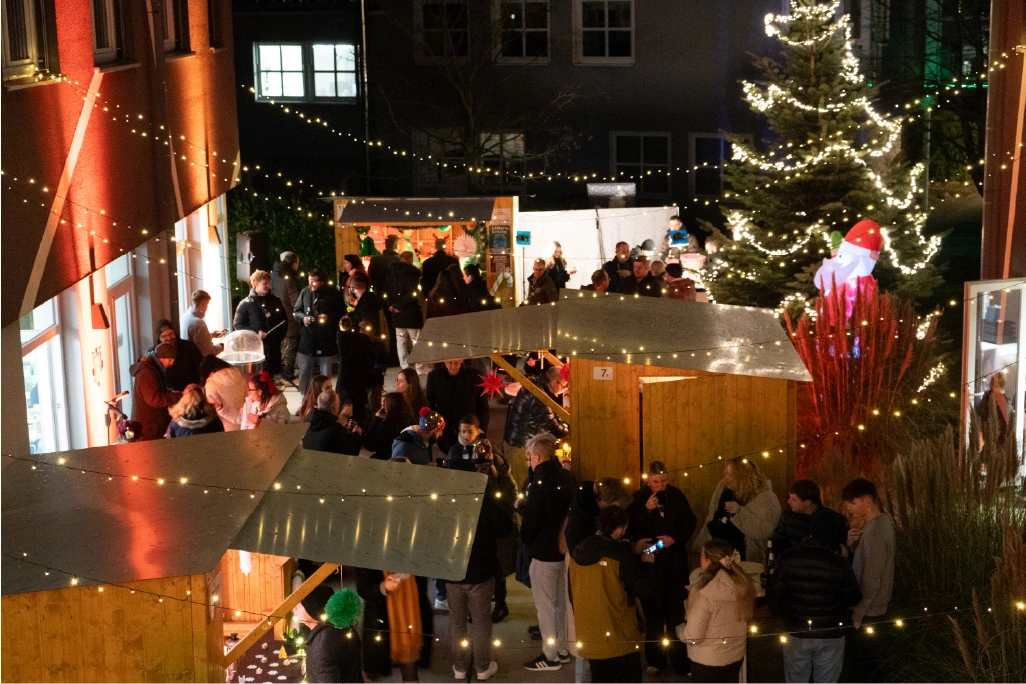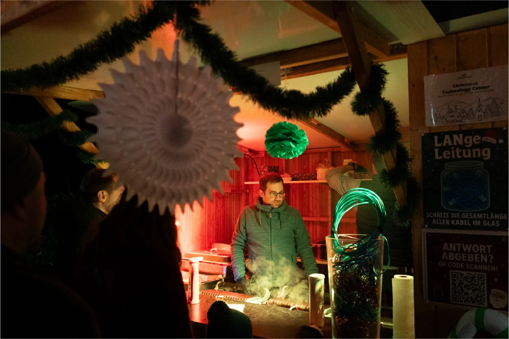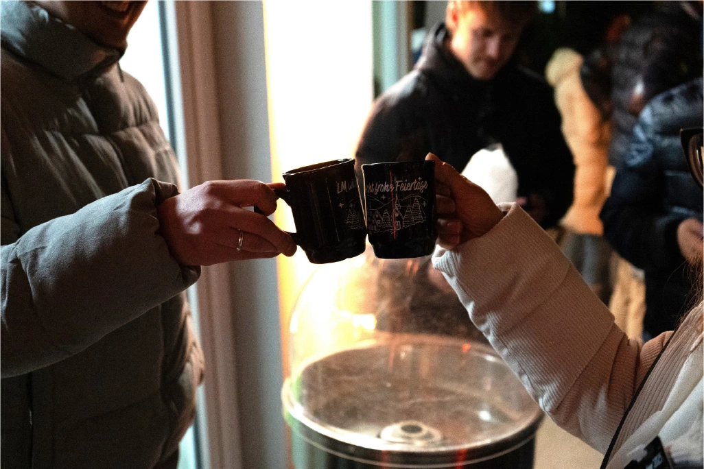 The festively decorated huts offered a varied selection of food and drinks: Mulled wine, waffles, crêpes, soup, chips and burgers covered the classic Christmas market favourites. There were also several competitions to keep visitors entertained. In the IT sound quiz, typical sounds such as a team call or the Windows 98 error had to be recognised. Guests could also test their estimation skills with different LAN cable lengths. Younger guests were also able to put their skills to the test in various games. There was also a special surprise for all visitors: LM mulled wine cups, which everyone could take home as a gift. Complemented by the atmospheric lighting, this created an authentic Christmas market atmosphere.