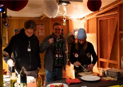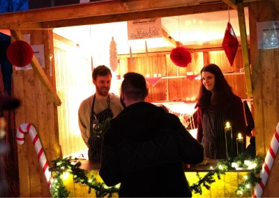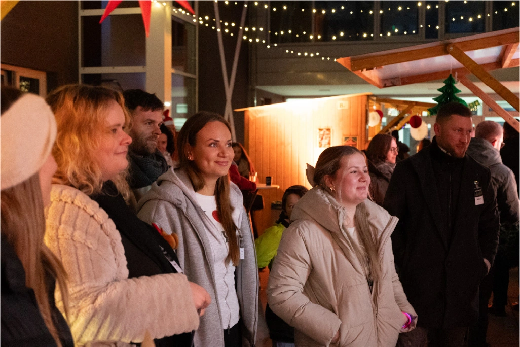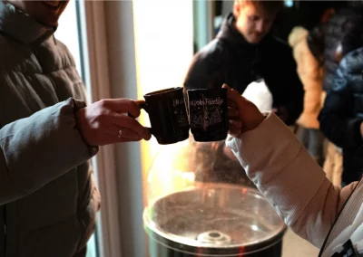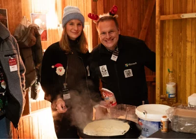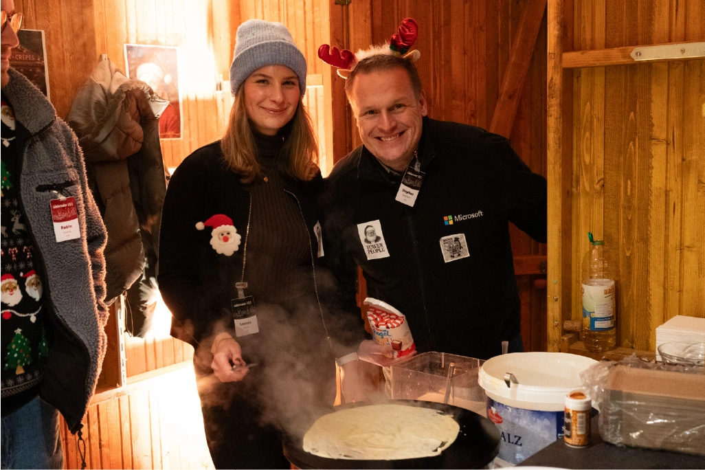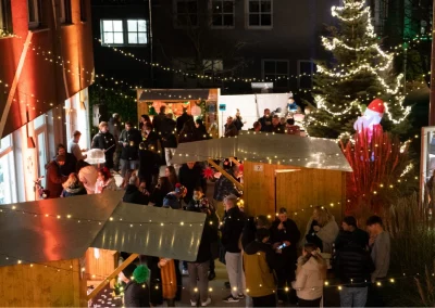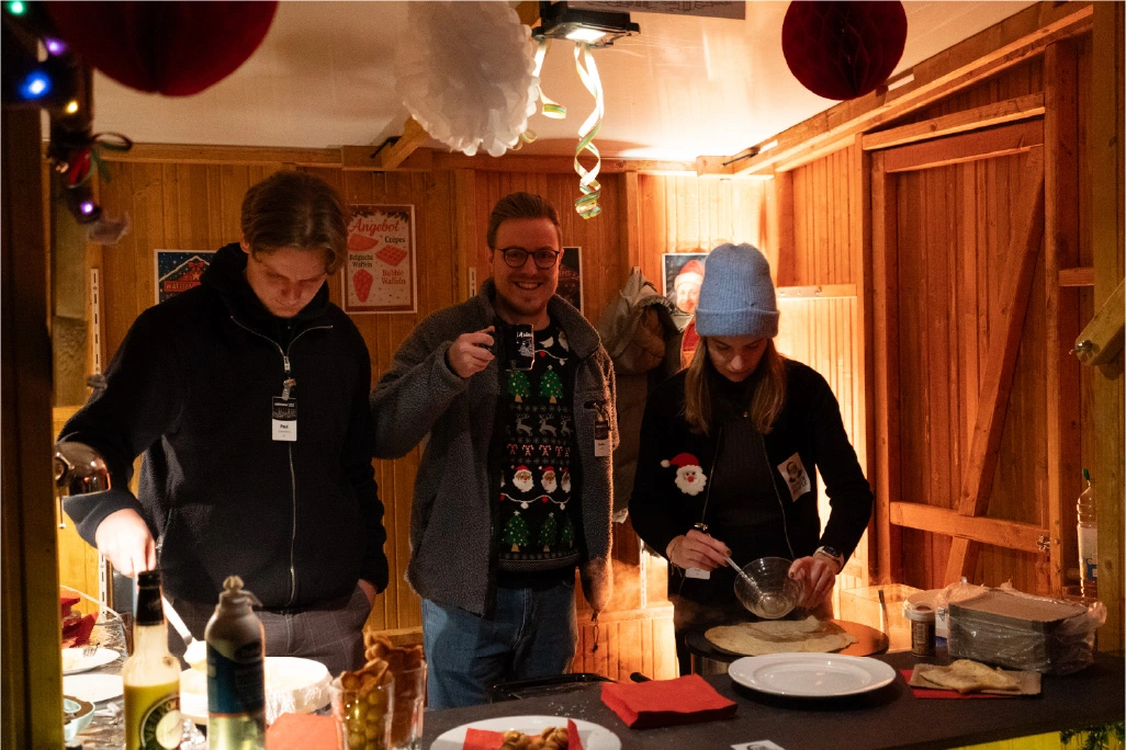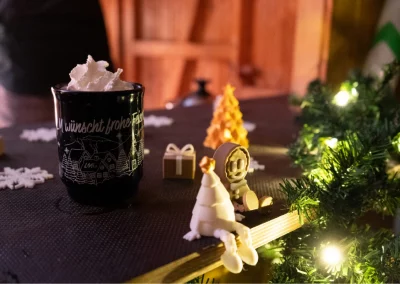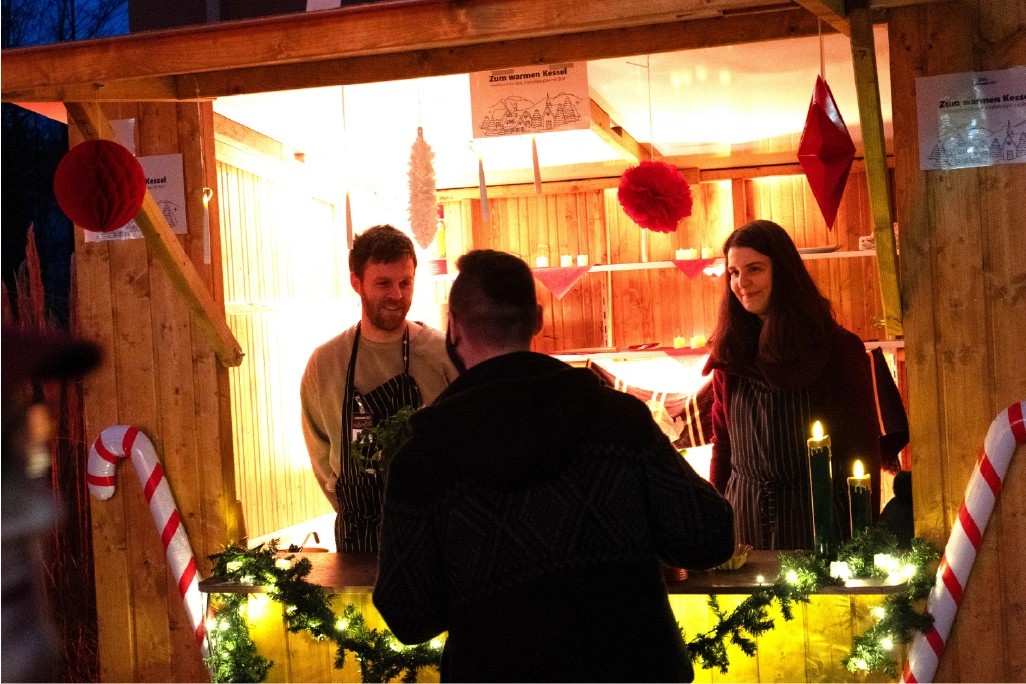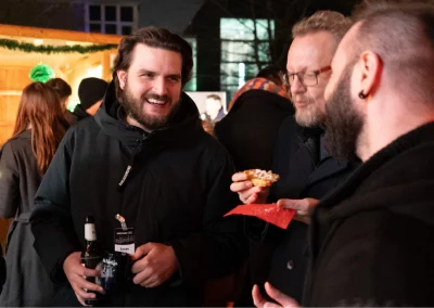 The festively decorated huts offered a varied selection of food and drinks: Mulled wine, waffles, crêpes, soup, chips and burgers covered the classic Christmas market favourites. There were also several competitions to keep visitors entertained. In the IT sound quiz, typical sounds such as a team call or the Windows 98 error had to be recognised. Guests could also test their estimation skills with different LAN cable lengths. Younger guests were also able to put their skills to the test in various games. There was also a special surprise for all visitors: LM mulled wine cups, which everyone could take home as a gift. Complemented by the atmospheric lighting, this created an authentic Christmas market atmosphere.